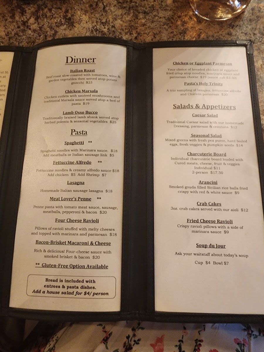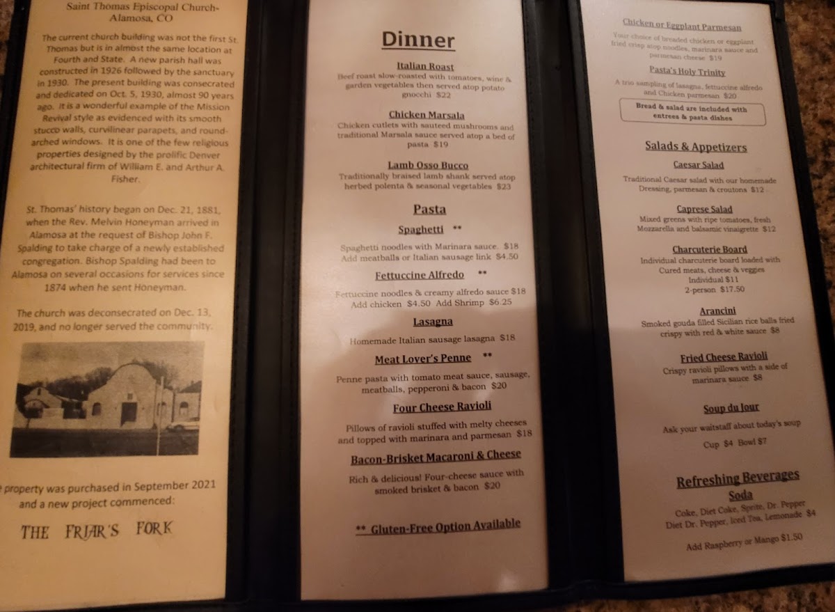 Welcome to The Friar's Fork, an enchanting Italian restaurant nestled in Alamosa, CO. This charming eatery, located at 607 Fourth St, is the perfect destination to indulge your culinary cravings. The menu showcases a delightful selection of pasta, with highlights like the Cheese Ravioli ($20) and the exquisite Pasta Trinity featuring fettuccine alfredo, lasagna, and chicken parmesan for just $23. Each dish is crafted with care, ensuring tender meats and vibrant accompaniments that ignite the palate.